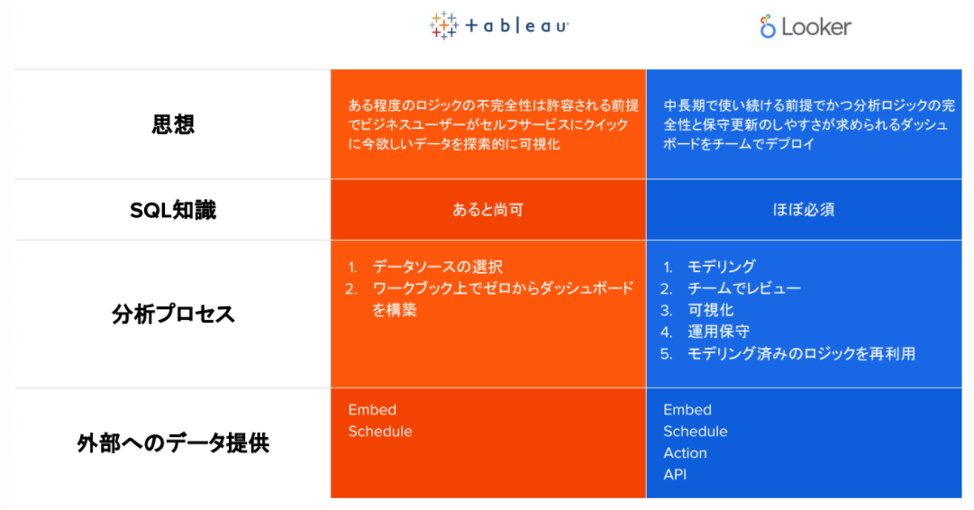 Tableauは「ある程度のロジックの不完全性は許容される前提で、ビジネスユーザーがセルフサービスにクイックに今欲しいデータを探索的に可視化」するのに対し、Lookerは「中長期で使い続ける前提で、かつ分析ロジックの完全性と保守更新のしやすさが求められるダッシュボードをチームでデプロイ」するものです。