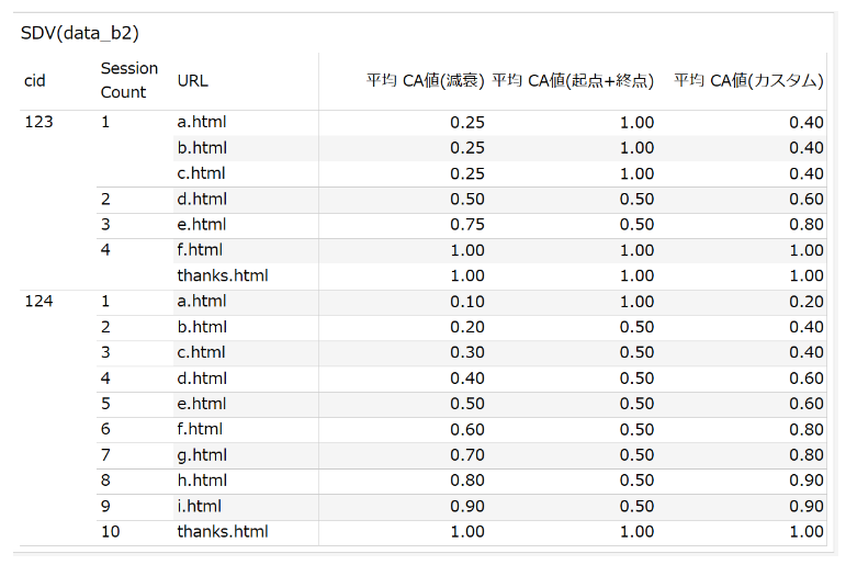 コンバージョンが発生したセッションを1とし、コンバージョンがから遠くなる(=コンバージョンが発生したセッションから遡る)ほどコンバージョンへの価値を低く見なす。というロジックで計算しています。具体的には、「コンバージョンが発生したセッションのセッションの数」で、「各セッションのセッションの数」を割っています。ユーザー123の初回訪問(セッションの数は1)は、コンバージョンの発生したセッション(セッションの数は4)に対して、/4=0.25という具合です。