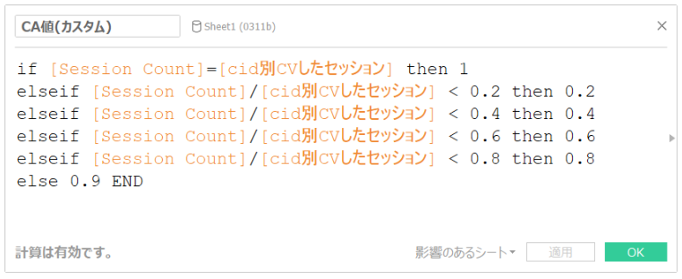 セッションの数が、コンバージョンが発生したセッションに対して「何合目」であったかを元に値を付与しています。計算式は以下の通りです。計算フィールドの閾値や、戻り値を変更することによって柔軟に付与する値を変更できるのが特徴なのでモデルとしては「カスタム」としています。