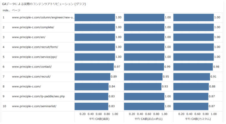 可視化した結果は以下です。プリンシプルのサイトのページ数はそれほど多くありませんので、臨場感にやや欠けますが、それぞれのページを、3つのContents Attribution値で評価できているのが確認できます。