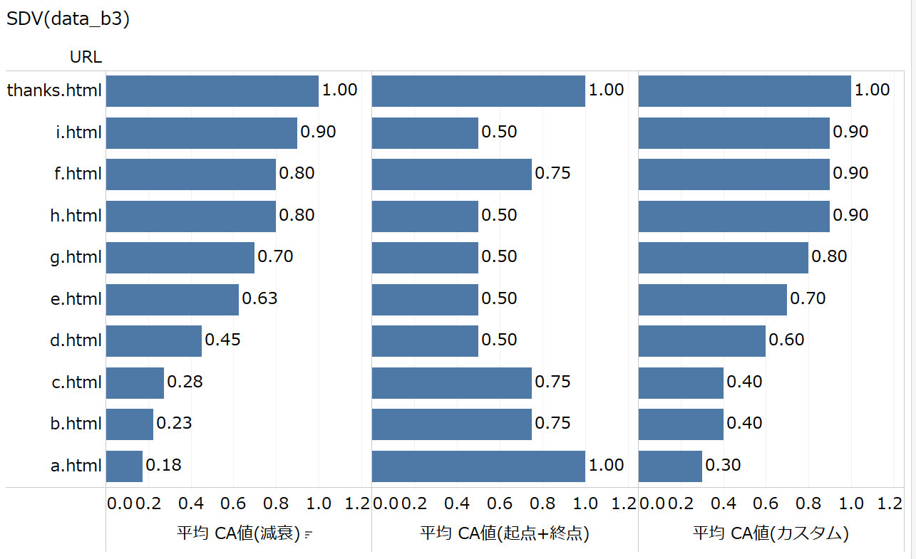 コンテンツアトリビューションではコンバージョン後に閲覧したコンテンツにはコンバージョンへの貢献はなかったものと見なすのが妥当ですので、ユーザー123の5番目のセッションはフィルタで除外し、3種類のアトリビューションモデルで各ページのコンバージョンへの貢献を可視化したのが、以下のVizです。