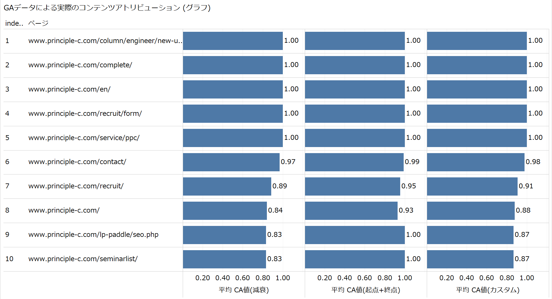 可視化した結果は以下です。プリンシプルのサイトのページ数はそれほど多くありませんので、臨場感にやや欠けますが、それぞれのページを、3つのContents Attribution値で評価できているのが確認できます。