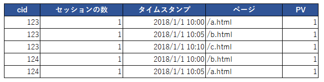 - b.html : 2 (ユーザー123のセッションの、c.htmlと、ユーザー124のセッションのa.html)