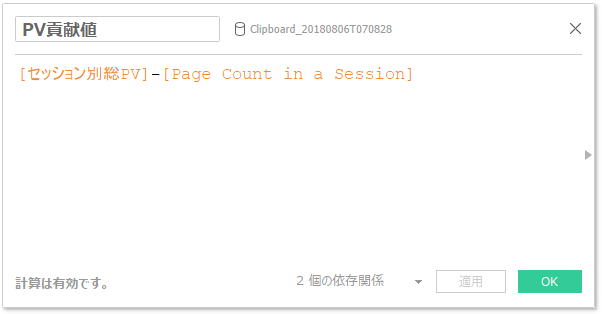 そこまでくれば後は先程の「セッション中の総PV数から、自分のヒットカウントを差し引いた値が、自分が閲覧された後に発生したPV数」というロジックで自分が発生させたPVの貢献値を取り出すことができます。