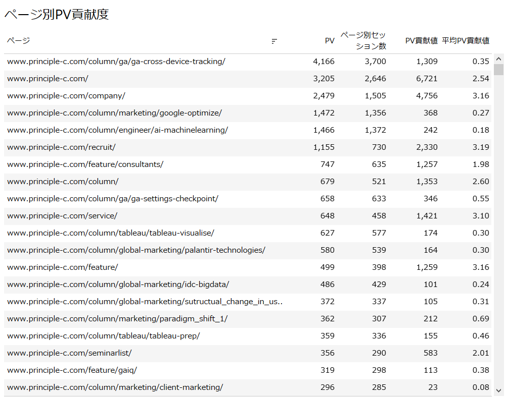 SDVでの検証が済んだので、次は実際のデータに当てはめてみます。プリンシプルのウェブサイトの実データです。サイトがメディアサイトではないので、必ずしもページビューを増やす必要はありませんが、それでも、以下のような分析が可能です。