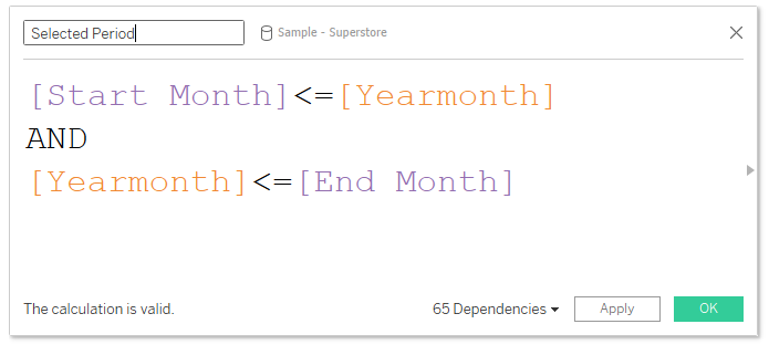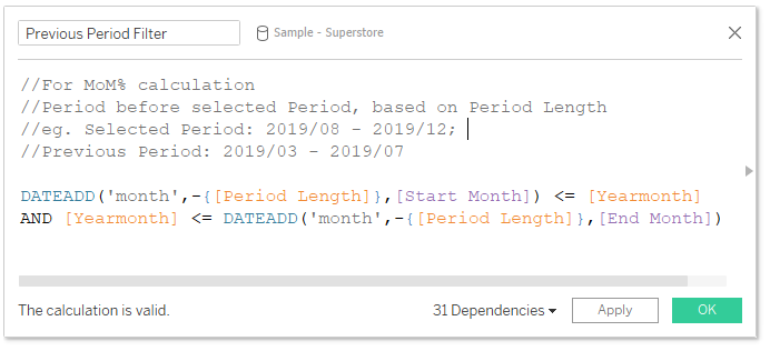 So, this is when we create parameters for starting (Start month) and ending (End month) of our selected period (2019/08 – 2019/12). In another calculated field, we use a DATEADD function with those parameters to calculate for past data (2019/03 – 2019/07 for MoM%).