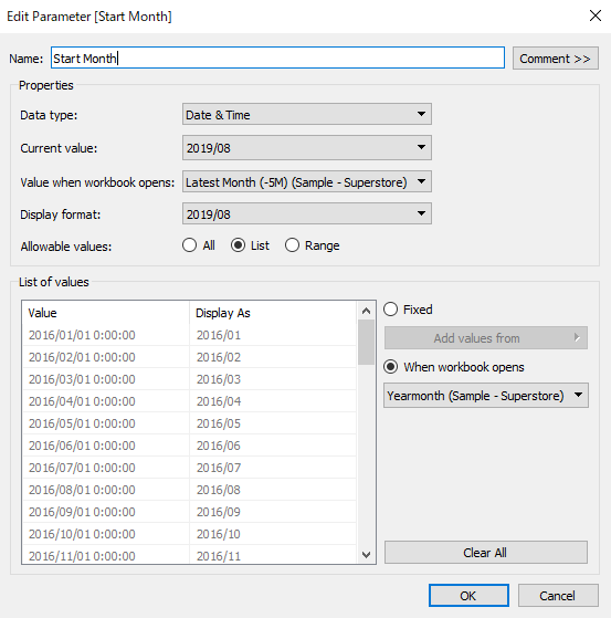 For example, consider if a client specifically requested to show the latest 5 months of data as the workbook default setting. Just as the previous example, we have Start Month and End Month parameters. All we have to do is create a new calculated field dated back from the latest month for 5 months, e.g. if the latest month is 2019/12, the new calculated field should yield 2019/08. Then I use this field in a Start Month parameter setting where it says “Value when workbook opens”.