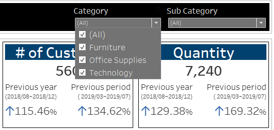 As you may have noticed, the category filter has the ‘(All)’ value which shows all data–meaning it is unfiltered. A parameter can do almost the same thing. We can add an ‘(All)’ value to a list of a parameter. Create a new calculated field then put it in the filter. Refer to how-to here.
