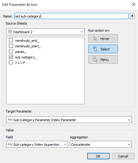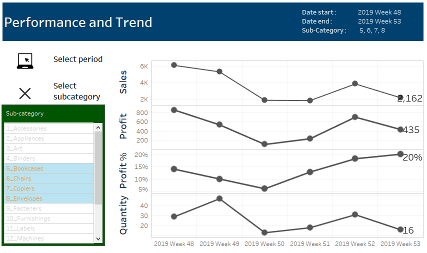 In addition, the action setting is set to “Concatenate,” which allows users to select multiple parameter values (holding ctrl+click). As shown, 4 sub-categories (5,6,7,8) are being selected and the line chart shows data for those 4 sub-categories.