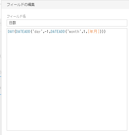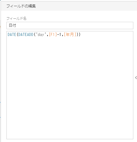 • 計算式: DATE(DATEADD(‘day’,[F1]-1,[年月]))