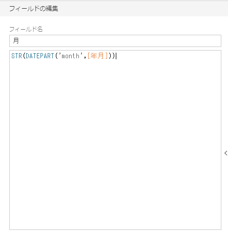 • 計算式:STR(DATEPART(‘month’,[年月]))