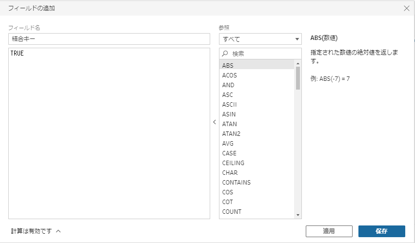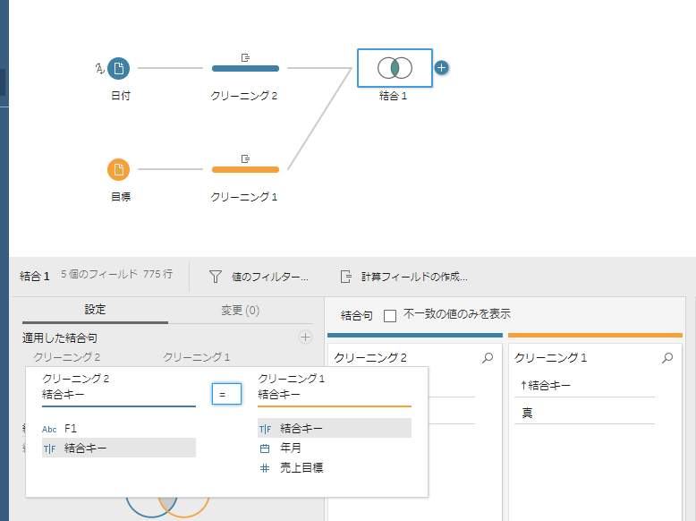 • 「適用した結合句」は上記2. 結合キーを作成 にて作成した「結合キー」を選択する。