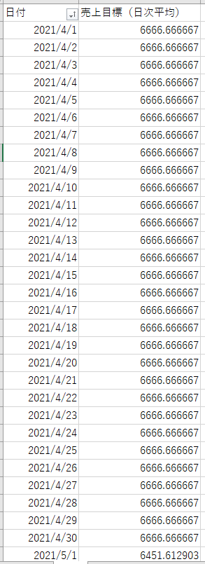 月単位の売上目標を日次目標に変換できました。