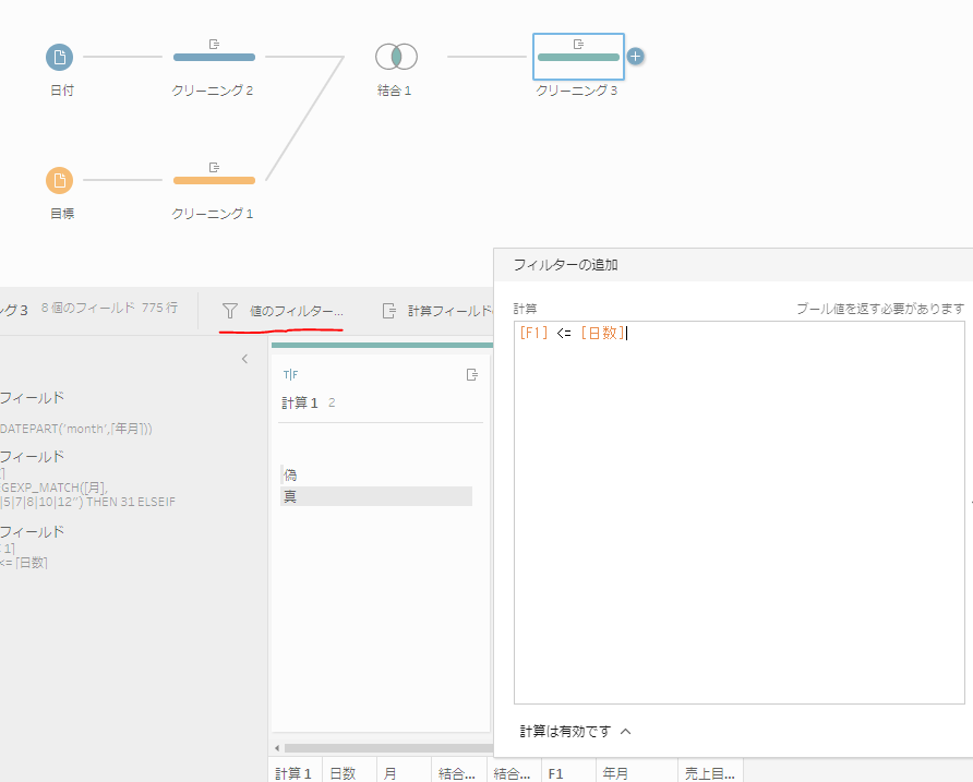 ④値のフィルターに下記計算を追加し、正しいに日付のみ絞ります