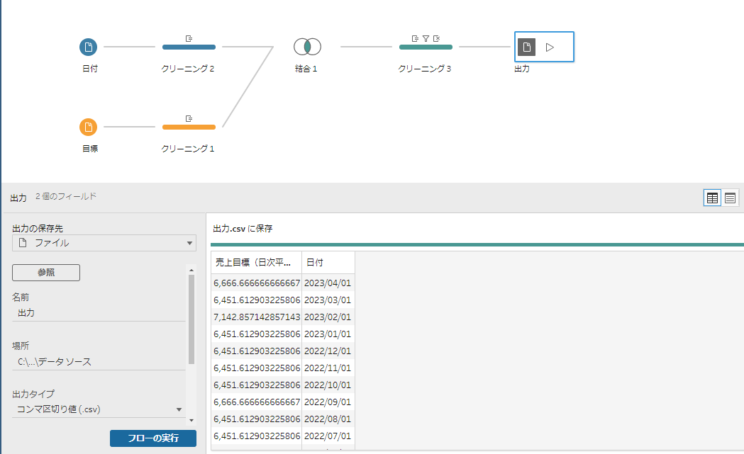 最後に、出力ステップを追加して、csvとして出力してみました。