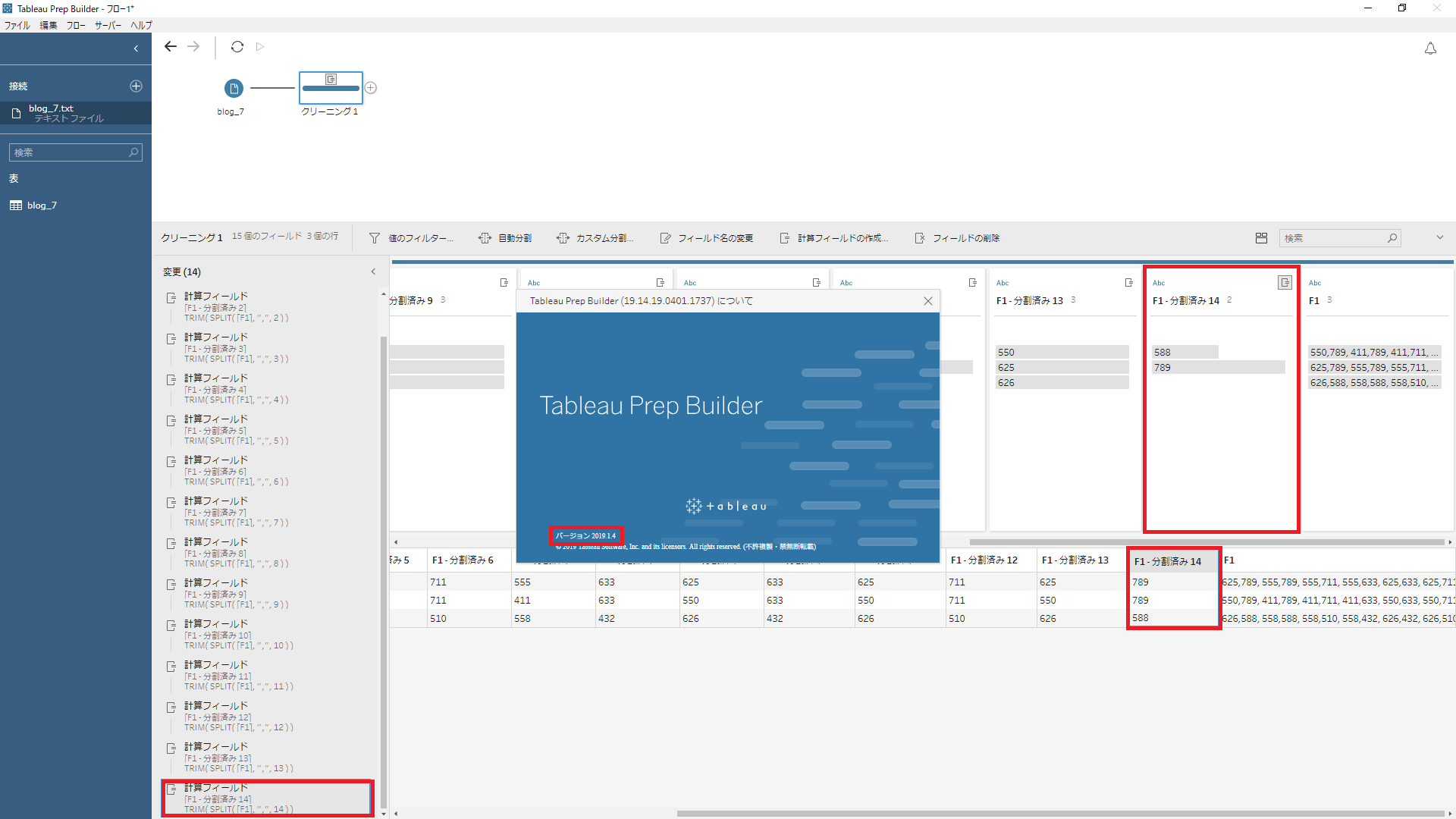 このデータをTableau Prep Builderで「,」を区切り文字として分割したい時、これが入力ファイルであれば最初の処理で14列に分割してくれます。ですが、これがクリーニングステップの途中だった時、バージョンによって分割の上限が存在した時期があります。