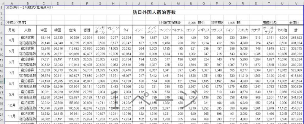 国名が複数列にまたがっています。こうしたデータを横持ちと呼びます。一方、「国名」という項目が1列だけあり、その列の中に、アメリカ、中国、台湾、、、と値が格納されるデータの持ち方が縦持ちと呼ばれます。一般的にはTableauは縦持ちのデータを上手にビジュアライズすることができます。