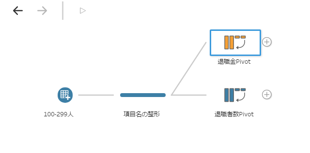 少々番外編の「できること」ではありますが、Maestro内でデータを「複製」することができます。ただし、明示的に「複製」や「コピー」メニューがある訳ではなく、一つの「ステップ」から処理を分岐させることで、実質的に分岐する前のデータをコピーして利用していることになります。例えば、以下の画像では「項目名の整形」ステップから2つのピボットに分岐していますが、これは「項目名の整形」データをコピーしていることに他なりません。以下に掲載している2つの動画の2つめでこの「データの複製」を利用していますので、詳しくはそちらを御覧ください。