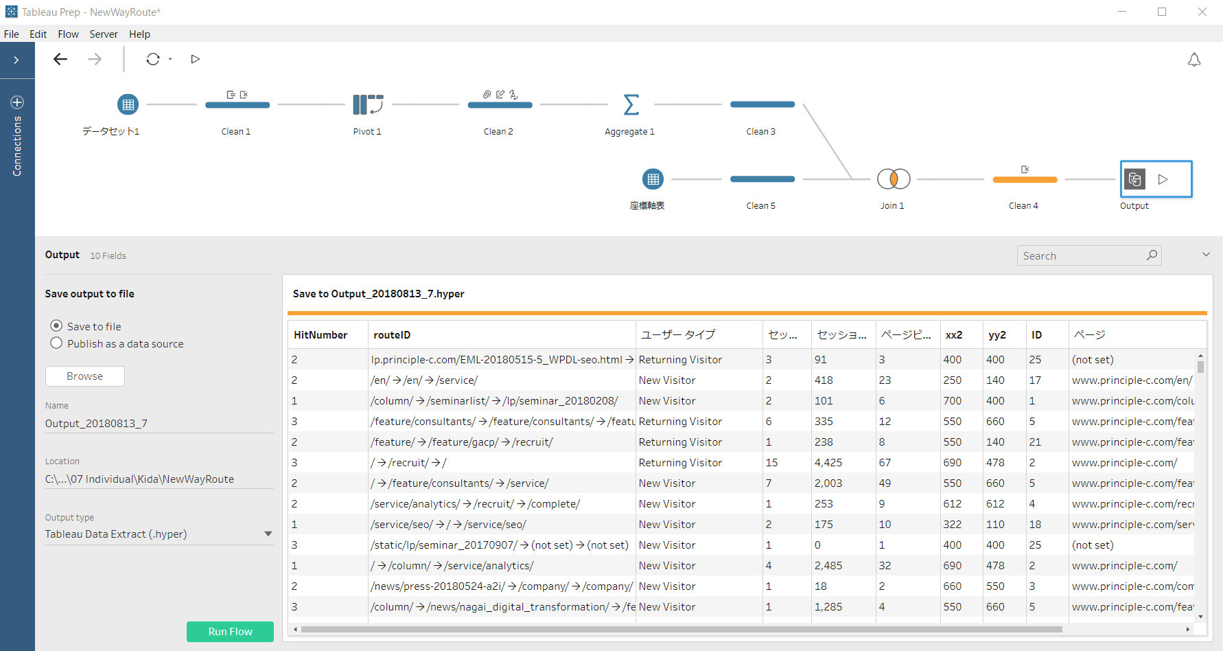 ルート別のセッション数等の元データについては、Tableau DesktopからGoogle アナリティクスに直接API接続したのではデータが望んだ形にならないため、Google アナリティクスのカスタムレポートを作成して、エクセルでエクスポートし、Tableau Prepを利用して、座標軸表のエクセルとJOINして作成しました。