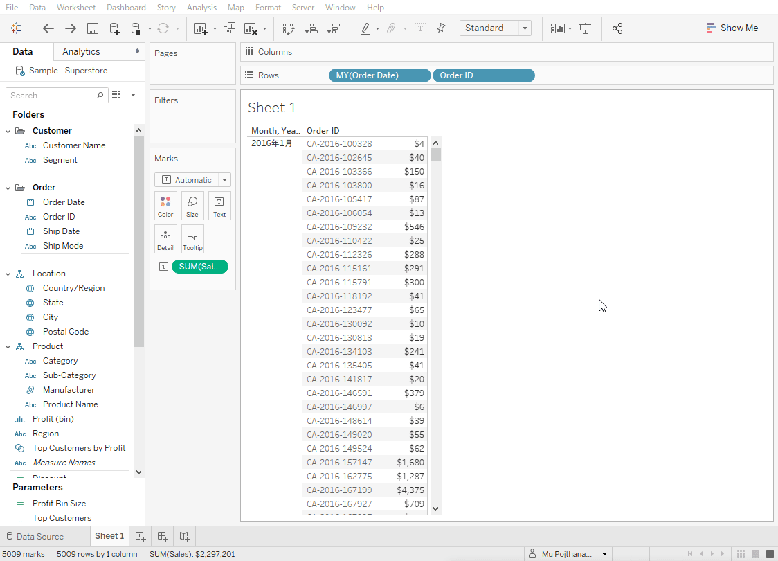 A common experience of Tableau users is dropping a date/datetime date type into a row or column only to find out it’s not in the format you want. Suppose, I drop the Order Date field into Rows. The date format that Tableau shows is only the year, and then I have to keep drilling down to see Quarter, Month etc.