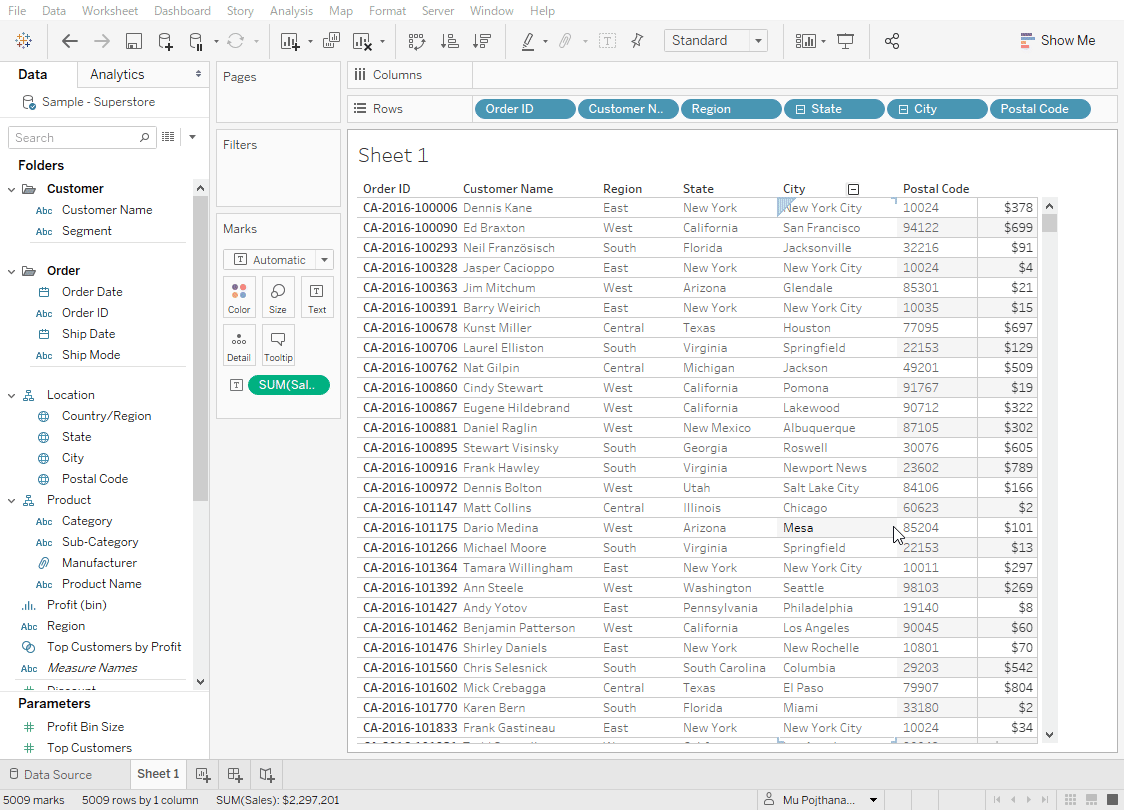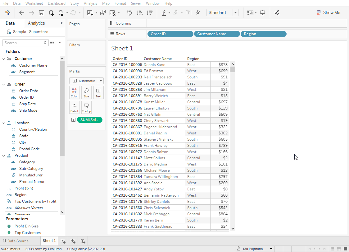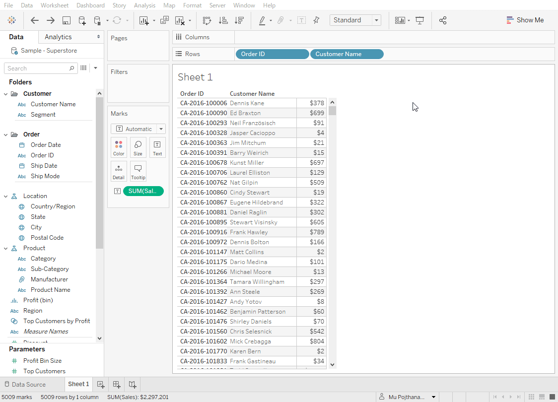 In this example, I already have a Sales in text, and want to create a horizontal bar chart. All I need to do is hold Ctrl and drag and drop the Sales pill into columns.