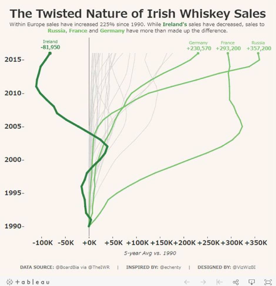 例えば、Tableau勉強法としてのMakeove Mondayのリバースエンジニアリングで紹介したAndy Kriebel作成の以下のVizですが、言いたいことは、「フランス、ドイツやロシアではアイリッシュウィスキーの需要は伸びているのに、本家アイルランドでは、むしろ減っているよね。本国と外国で”ねじれ”があるよね」ということと理解できます。