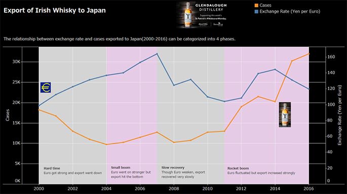私が同じデータで可視化した、以下のVizで言いたいことは「日本でのアイリッシュウィスキーの需要は、為替変動に影響されて増減を繰り返した時期もあるが、最近はそれを乗り越えて拡大しているね」ということでした。(今振り返ると、”Irish Whisky accelerates its sales in Japan in spite of strong Euro”とでもすればよかったですね。タイトル大事。)