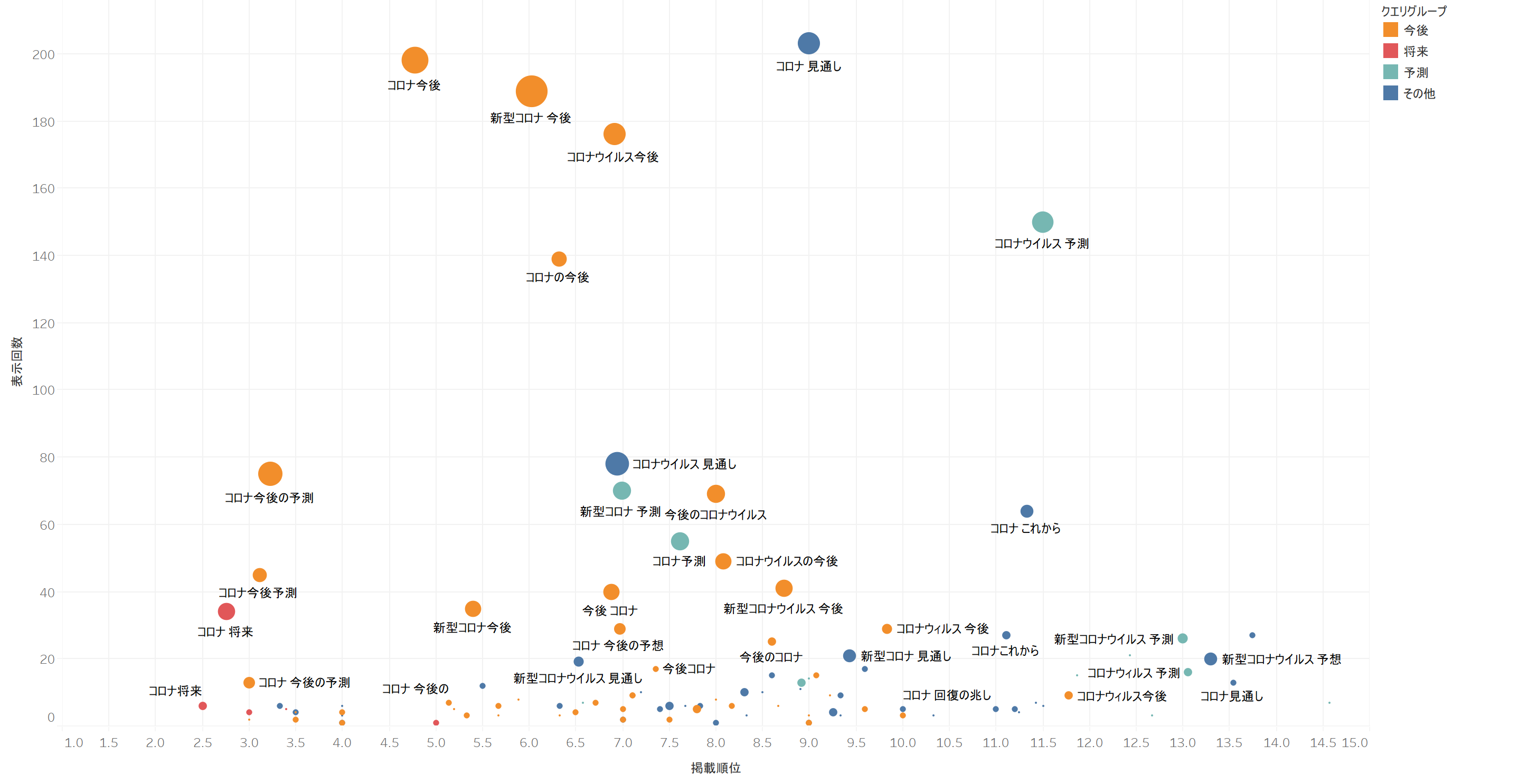 図の説明:Search ConsoleのデータをダウンロードしてTableauで可視化。データは4月5日のもので、縦軸が表示回数、横軸が平均掲載順位、円の大きさがクリック数をあらわす。キーワードを「今後」を含むもの、「予測」を含むもの、「将来」を含むもの、その他の4つのグループに分け、それぞれで色分け。