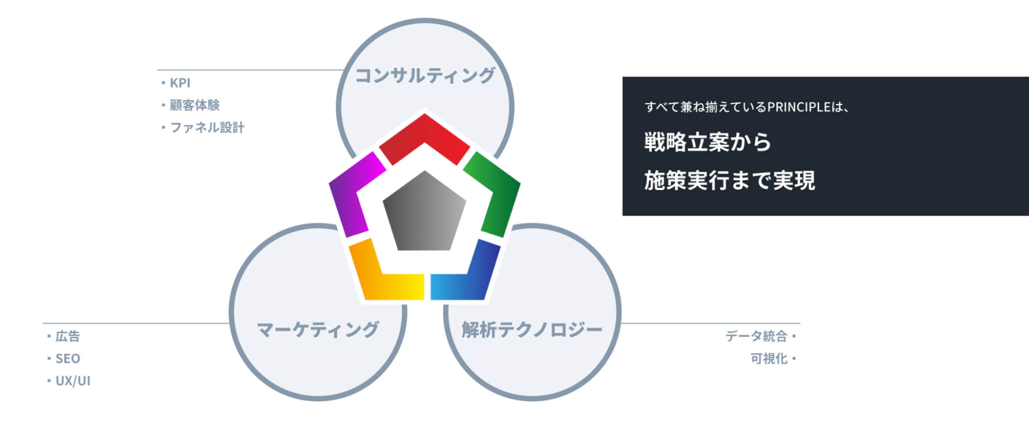 プリンシプルはデジタルマーケティングのプロフェッショナル集団です。「コンサルティング」「データ技術」「運用・実行」の分野で高いレベルのサービスを提供していますが、トータルでサービス提供できる企業は日本では少ないので同業他社とは差別化されています。