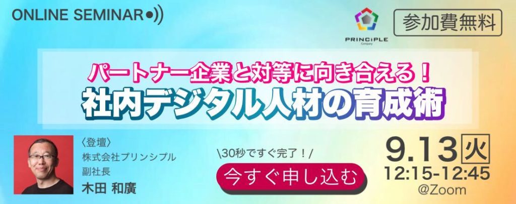 本セミナーでは、広告代理店などをはじめとするパートナー企業と対等に向き合いビジネスの成果が出せるDX人材を社内で早期に育成する方法を、弊社ならではのナレッジをもとにお話しいたします。