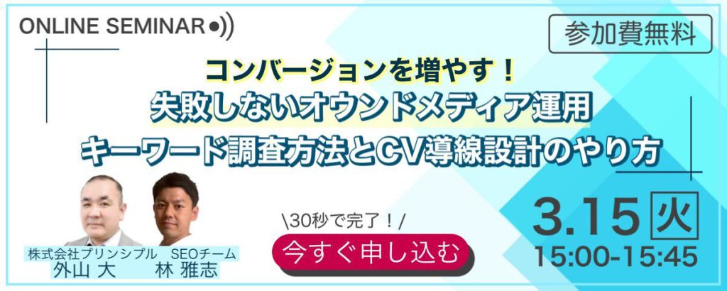 本セミナーでは、「キーワードマーケティング調査方法」と「オウンドメディアのCV導線設計」のお話をさせていただき失敗しないオウンドメディア運用ができるようになることを目的とします。