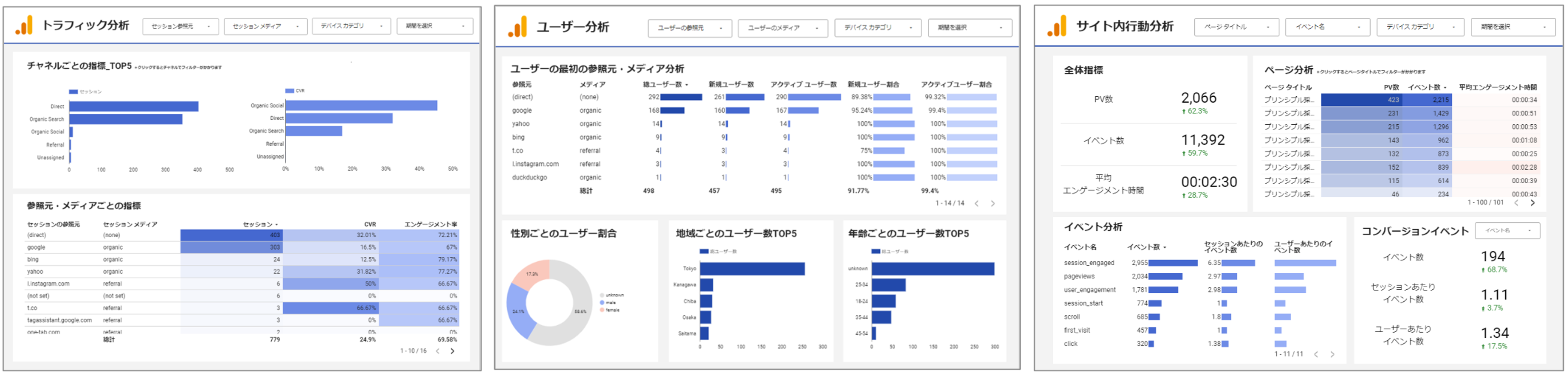 トラフィック分析、ユーザー分析、サイト内行動分析