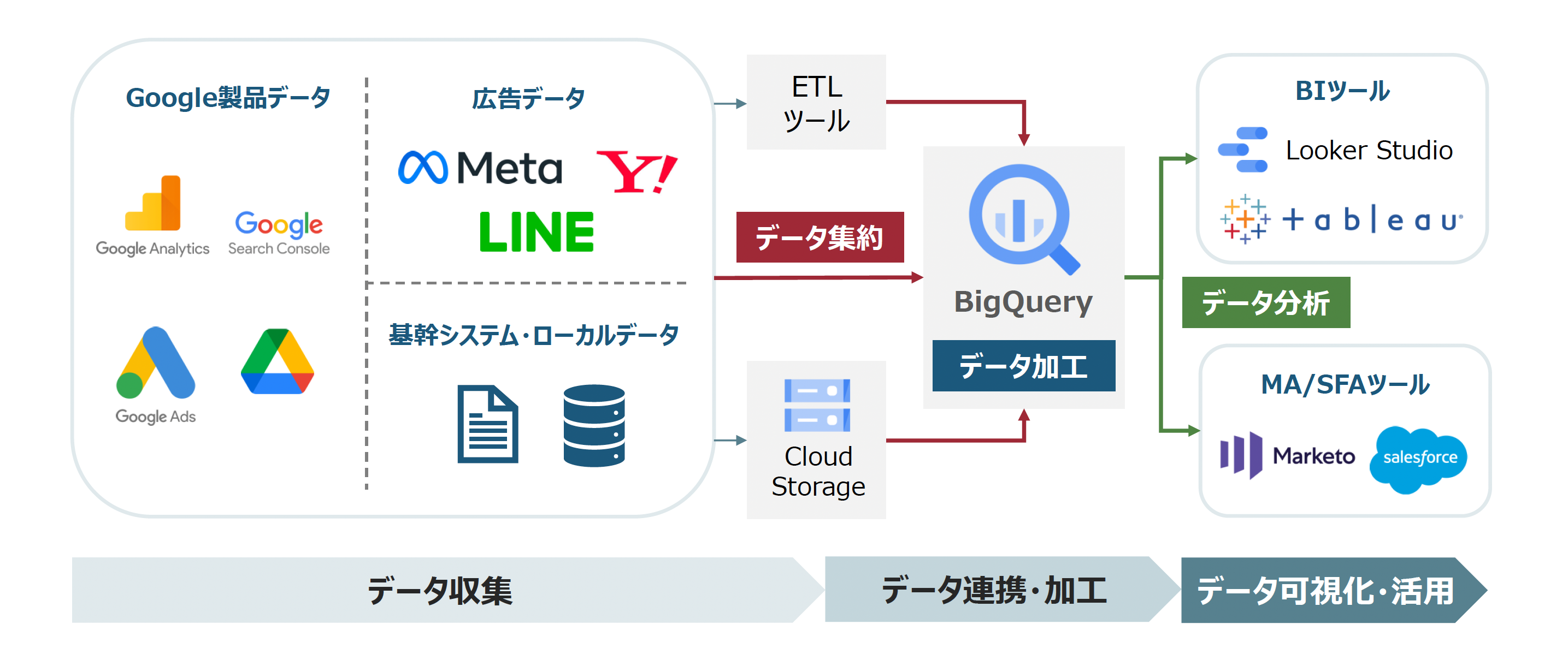 GA4、Google Search Console、広告・SNSデータ(GoogleAds、Yahoo!、facebook、Instagram、LINE、TikTok、linkedin、Xなど)、MAツール(Marketo)、SFAツール(Salesforce)、Googleスプレッドシート、CSVファイル等、様々なデータを集約可能です。※ETLツールの利用を前提としています。