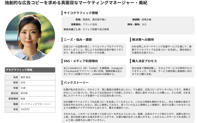 AIを活用したマーケティングサービスを探しているマーケティングマネージャーを想定したペルソナとカスタマージャーニーのイメージです。