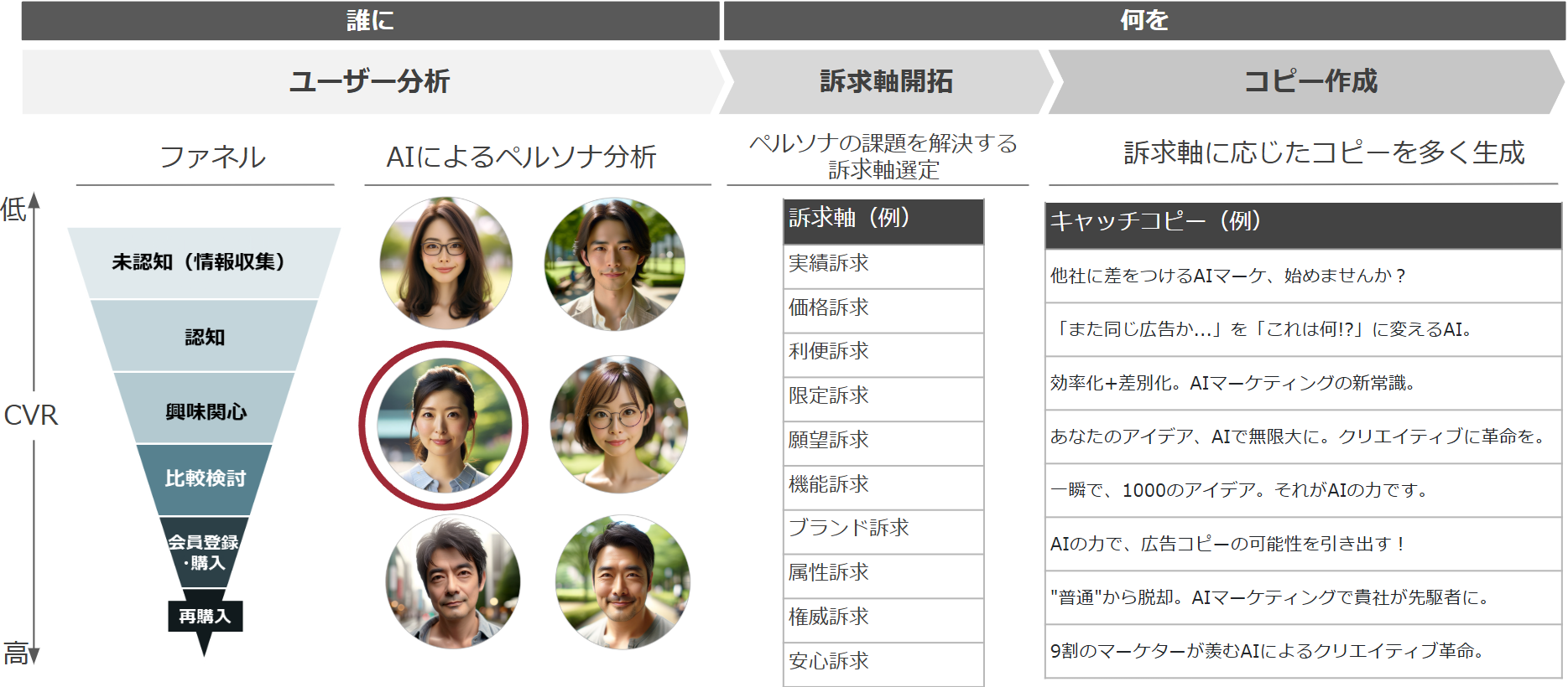 AIを活用したユーザー分析に基づき、訴求軸の開拓とコピー作成を行います。